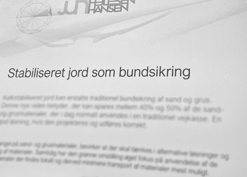 Kalkstabiliseret jord kan erstatte traditionel bundsikring af sand og grus. Denne nye viden betyder, der kan spares mellem 40% og 50% af de sand- og grusmaterialer, der i dag normalt anvendes i en traditionel vejkasse. En god løsning, hvis den projekteres og udføres korrekt.